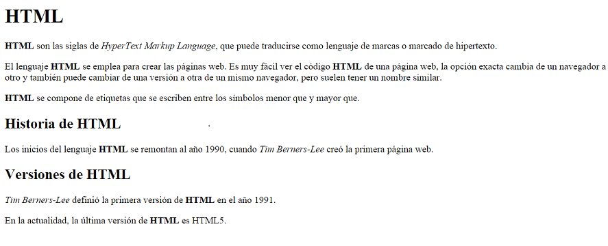 Un encabezado de nivel 2 con el texto "Versiones de HTML" antes de dos nuevos párrafos que contienen el texto "Tim Berners-Lee definió la primera versión de HTML en el año 1991" y "En la actualidad, la última versión de HTML es HTML5".