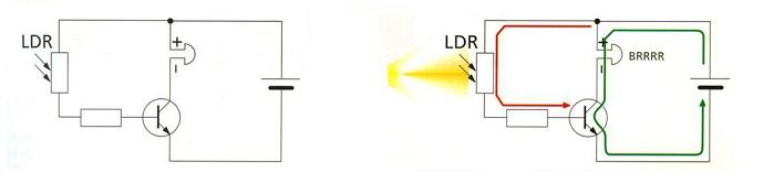 Cuando hay poca luz, la resistencia de la LDR es alta y la corriente que pasa hacia la base del transistor es demasiado pequeña como para poner en comunicación el colector y el emisor y , por tanto, el zumbador no sonará. Si aumenta el nivel de luz en la habitación, la resistencia de la LDR bajará, dejando pasar hacia la base del transistor una pequeña corriente que ahora si será capaz de poner en comnicacion el colector y el emisor, haciendo que el zumbador suene.