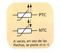 Es una resistencia variable, pero, en este caso, el valor de la resistencia depende de la temperatura. Las hay de dos tipos: PTC (Positivo Temperature Coefficient) o de coeficiente positivo, en las que. al aumentar la temperatura, aumenta también el valor de la resistcneia. y NTC (Negativo Temperature Coefficicnt) o de coeficiente negativo, en las que ocurre lo contrario.
