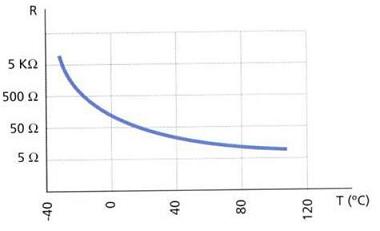 En la gráfica puedes ver una curva de variación de la resistencia en función de la temperatura de una NTC, que es el tipo que más utilizaremos en el aula.
