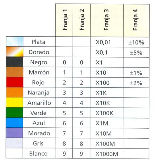 b) Indica en una tablas los distintos valores que pueden tener las resistencias según sus franjas de colores.