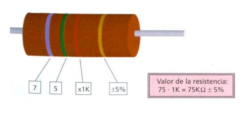Las resistencias, dado su pequeño tamaño, no llevan impreso su valor sobre su superficie. En su lugar, llevan cuatro franjas de colores y con las tres primeras, usando el código de colores, podemos conocer el valor teórico del componente.