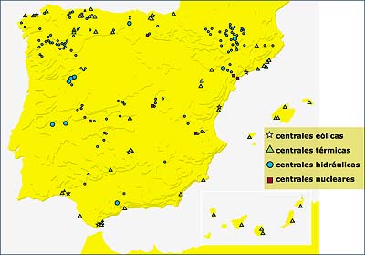 Además, existen otras instalaciones capaces de producir electricidad en industrias con sistemas de cogeneración y un número difícil de evaluar de pequeñas instalaciones de paneles fotovoltaicos. En este mapa se representan las centrales térmicas, nucleares e hidroeléctricas de mayor producción. Se observa cómo las centrales se concentran en la franja norte, con mayores recursos hidráulicos y más abundantes reservas de carbón, así como en la costa. El interior, especialmente la zona no montañosa de la gran meseta central, apenas posee centrales de ningún tipo. No obstante, en los últimos años se han instalado muchos parques eólicos en el sistema Ibérico. |