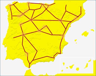 El mapa muestra la disposición general de las líneas de transporte de 400 kV. La mayor parte de las rutas principales están servidas por dos, tres o cuatro líneas de alta tensión. Los círculos de color muestran zonas de concentración de subestaciones de modificación de voltaje, tanto para el transporte como para el consumo. Por ejemplo, las existentes en la periferia del área metropolitana de Madrid reducen el voltaje para el consumo comercial, mientras que las presenciales en el área del Bajo Tajo elevan la tensión de la electricidad producida en las grandes centrales hidroeléctricas de la zona.