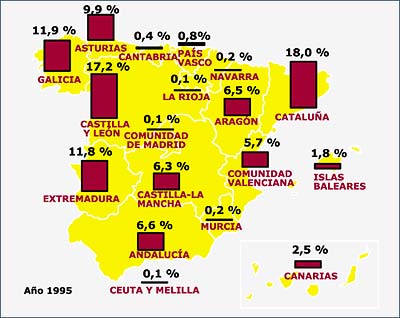 Otras consumen mucho más de lo que producen (el caso extremo es Madrid, con una producción 100 veces inferior a su consumo): por ejemplo, la Comunidad Valenciana, Murcia, Andalucía o el País Vasco. Por último, otras comunidades tienen un balance de producción positivo, como es el caso de Asturias y Galicia, o incluso están "especializadas" en la producción de energía eléctrica, como es el caso de Castilla y León y sobre todo de Extremadura, que produce ocho veces más de lo que gasta. Producción de electricidad por comunidades autónomas, en porcentaje sobre el total.